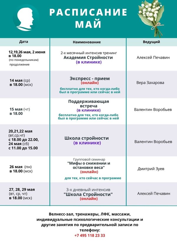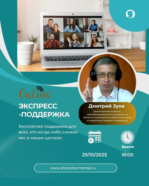 вдохновение для движения вперёд, задать важные вопросы и получить профессиональные ответы от Алексея, услышать живые истории и решения, просто быть в кругу людей, которые действительно понимают. Алексей Печавин — практикующий психотерапевт с опытом более 15 лет в сфере снижения веса, системный семейный специалист и эксперт команды «Доктор Борменталь». Он умеет поддерживать, вдохновлять и помогать видеть путь — спокойно и глубоко. Запись: бесплатно по России) или WhatsApp Будьте во всеоружии перед майскими праздниками! Записывайтесь прямо сейчас и приходите за мотивацией и поддержкой!