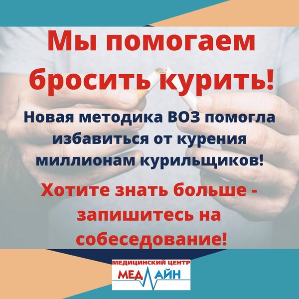 Давно мечтаете бросить курить? В этом Вам поможет медицинский центр «МедЛайн»! Записывайтесь на консультацию по тел: 23-72-72, 23-60-77,, Наши двери открыты для Вас в будние дни с 9.00 до 17.00, в субботу с 9.00 до 14.00, в воскресенье — выходной. Мы располагаемся по адресу: г.Нур-Султан, ул.Кумисбекова 8, ВП-20.