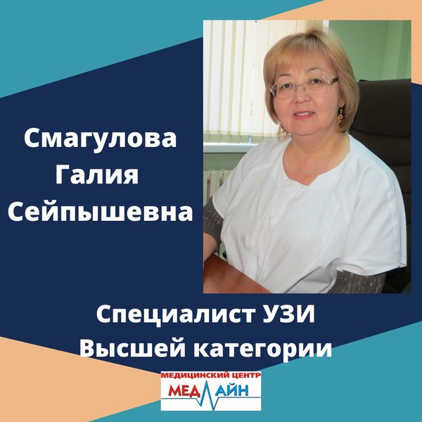 Наши специалисты ⠀ Смагулова Галия Сейпышевна ⠀ Специалист УЗИ (ультразвуковое исследование) ⠀ Врач Высшей категории Специализация: лучевая диагностика Общий стаж работы 23 года. Закончила Целиноградский государственный медицинский институт по специальности «Лечебное дело» в 1989 году. Курсы по повышению квалификации: 2007 год — первичная специализация по ультразвуковой диагностике г.Алматы; 2008 год — «Миография» г.Санкт-Петербург; 2011 год — «Ультразвуковая диагностика брюшной полости. Ультразвуковая диагностика в гинекол… — Читать дальше