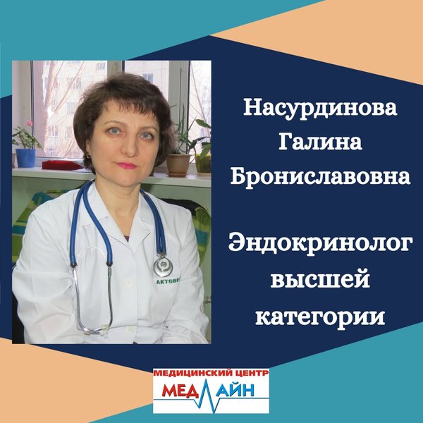 Наши специалисты Насурдинова Галина Брониславовна Эндокринолог высшей категории Закончила Целиноградский государственный медицинский институт по специальности «Лечебное дело» в 1990 году. Общий стаж работы 30 лет. Стаж по эндокринологии более 15 лет. Специализации по вопросам эндокринологии в городах Москва, Астана, Алматы. Курсы по повышению квалификации: «Неотложные состояния в эндокринологии» — март 2017 года в Медицинском университете «Астана» города Астана. За отличную работу и профессионализм неоднократно была награжде… — Читать дальше