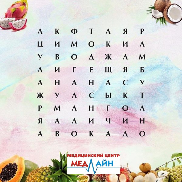 Фруктовая головоломка Сколько экзотических фруктов нашли на картинке? Наши двери открыты для Вас в будние дни с с 08:00 до 20:00, в субботу с с 08:00 до 14:00, в воскресенье — выходной. Мы располагаемся по адресу: г.Нур-Султан, ул.Кумисбекова 8, ВП-20. ⠀ Запись по тел: 23-72-72, 23-60-77,,
