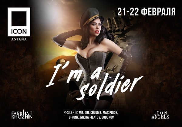 21—22 февраля ICON чествует сильную половину на фирменной вечеринке «I’m a soldier». Никаких границ и запретов, на этот раз вы окажетесь под надёжной защитой обворожительных девушек в камуфляже. ⠀ До 01:00 ночи: угощаем шотами всех гостей; для девушек free вход.