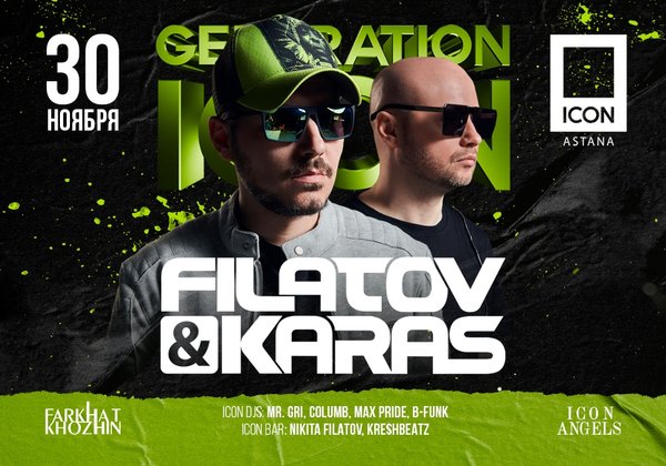 30 ноября в ICON впервые выступит знаменитый московский дуэт Filatov & Karas; герои фестиваля Tomorrowland и авторы сверхпопулярных танцевальных хитов «Time Won’t Wait», «Au Au» и «Возьми мое сердце». Сегодня Filatov & Karas необычайно популярны не только в России, но и за её пределами: диджеи стали желанными гостями на крупнейших фестивалях мира. На этот раз они впервые посетят Казахстан. ICON, let's dance! ⠀ Забронируйте лучший столик! пр. Туран 21 // Turan av.