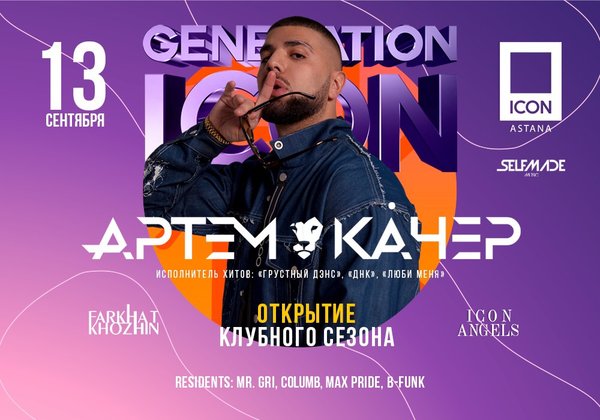 13 сентября ICON собирает друзей на открытие клубного сезона: первую в сезоне вечеринку Generation ICON открывает Артем Качер; популярный российский певец, участник телешоу «Голос» и исполнитель хитов «Яд», «Люби меня», «ДНК» и «Грустный дэнс». ⠀