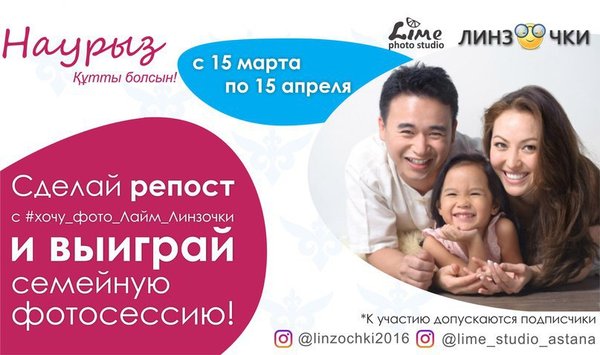 ВНИМАНИЕ! ВНИМАНИЕ! ВНИМАНИЕ! Дорогие друзья!!! Салон оптики Линзочки совместно с фотостудией Lime, в честь весеннего праздника Наурыз, дарит подарки! Хочешь выиграть семейную фотосессию? Условия очень простые: 1. Подписаться или уже быть подписчиком @linzochki2016 и фотостудии @lime_studio_astana 2.Разместить у себя репост конкурсного фото 3.Под фотографией в вашем аккаунте разместить конкурсный тег #хочу_фото_Лайм_Линзочки 4. Ваш профиль должен быть открытым на время проведения конкурса