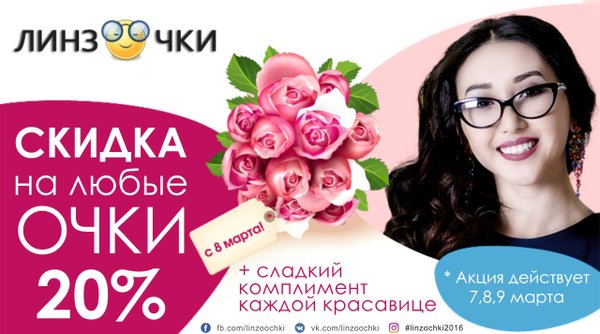 Дорогие, дамы!!! Поздравляем Вас с наступающим женским днем и как всегда спешим дарить подарки!!! С 7 по 9 марта скидка 20% на любые очки, а так же сладкий сюрприз каждой представительнице слабого пола!!!Ждем Вас по адресу: г. Астана ул. Акмешит д.5 тел: