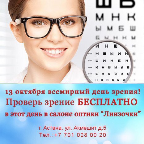 Дорогие друзья! В честь праздника, мы дарим 50% скидку на линзы для очков, при предъявлении пенсионного удостоверения!!! Берегите свои глазки! Г. Астана ул.Акмешит д.5 тел: