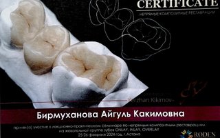 2024 — Семинар по непрямым композитным реставрациям на жевательной группе зубов ONLAY, INLAY,OVERLAY, организатор Roden, лектор Ержан Кикимов, г. Астана.