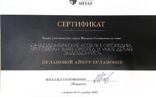 2022 — «Эндодонтические аспекты в ортопедии: что обязан знать ортопед и уметь делать эндодонтист», организатор учебный центр VitaliyShtaf, спикер Михаил Соломонов, Израиль;