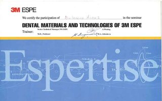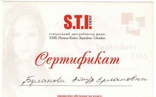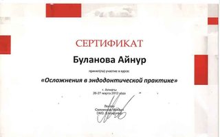 2012 — «Эстетическая реставрация», организатор Алматинский стоматологический институт последипломного обучения (АСИПО), лектор Колендарева Г. А., г. Алматы;