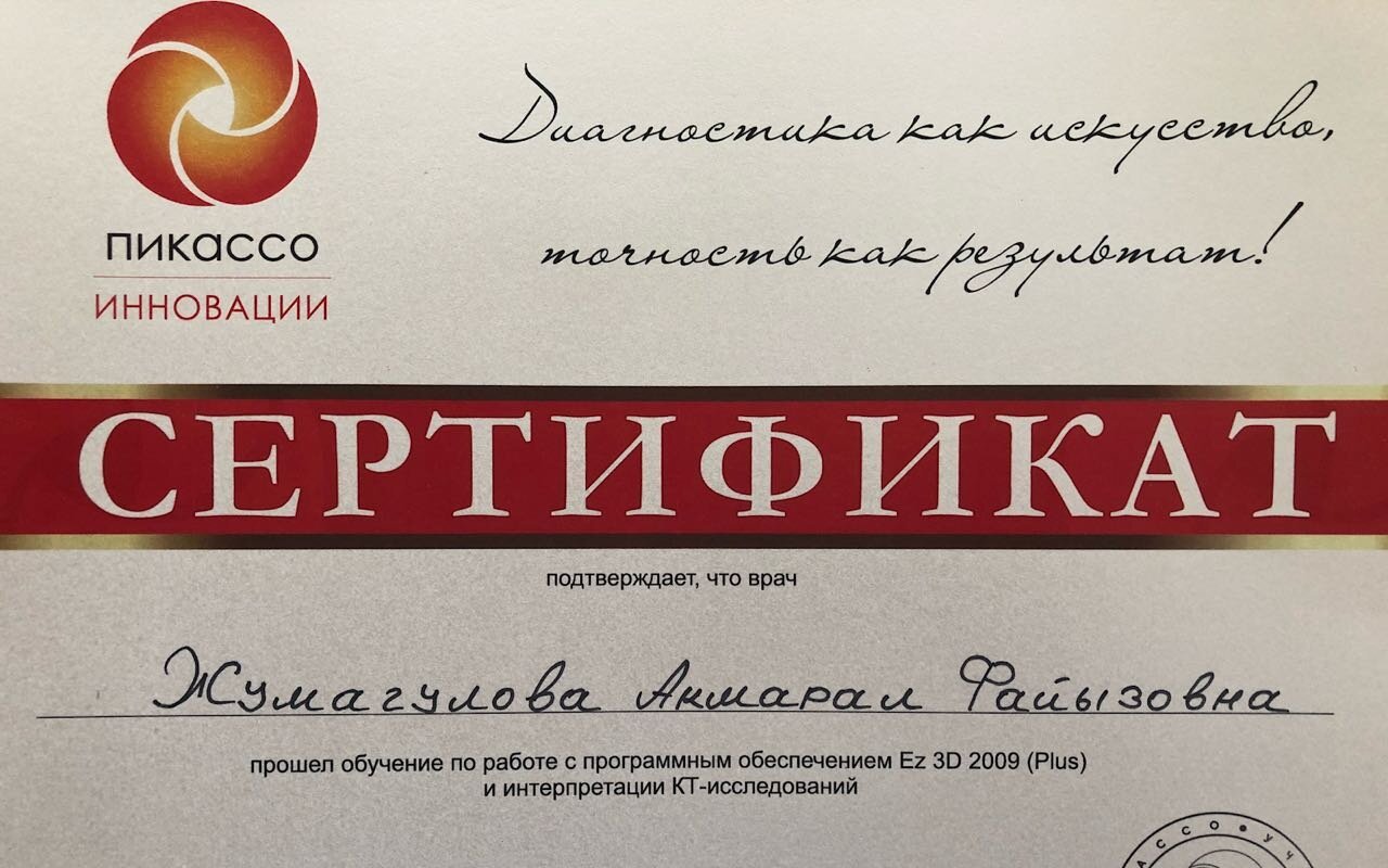 2009 — «Работа с программным обеспечением EZ 3D 2009 (Plus) и интерпретации КТ–исследований», организатор учебный центр «Пикассо», спикер Ярулина З. И., г. Алматы.