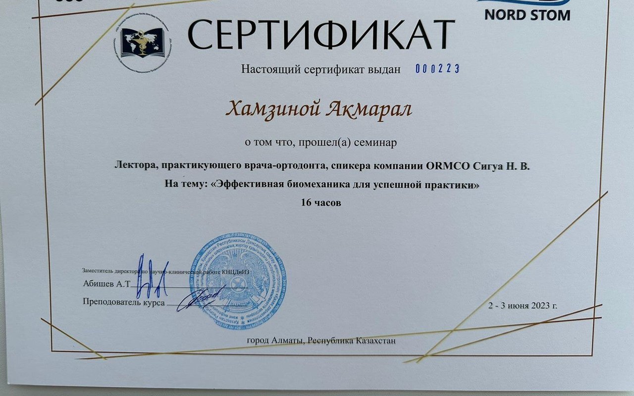 2022 — «Продвинутый курс. Современные протоколы лечения различных патологий зубочелюстной системы. Подход к лечению 1,2,3 класса, восстановление симметрии зубных рядов», организатор компания ORTHOART, лектор Dr. Nurtdinov I. R., Алматы;