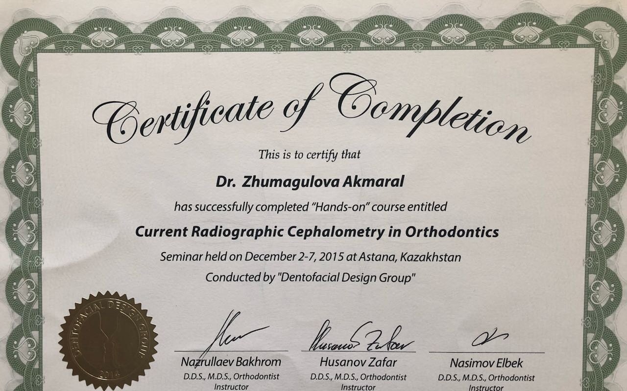 2015 — «Current Radiographic Cephalometry in Orthodontics», организатор Dentofacial Design Group, спикеры Nazrullaev Bakhrom, Husanov Zafar, Nasimov Elbek, г. Астана;
