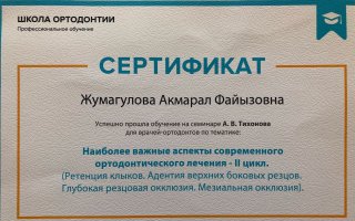 2017 — «Наиболее важные аспекты современного ортодонтического лечения – II цикл». (Ретенция клыков. Адентия верхних боковых резцов. Глубокая резцовая окклюзия. Мезиальная окклюзия), организатор «Школа ортодонтии» совместно с компанией Ormco, спикер Тихонов А. В., г. Алматы;