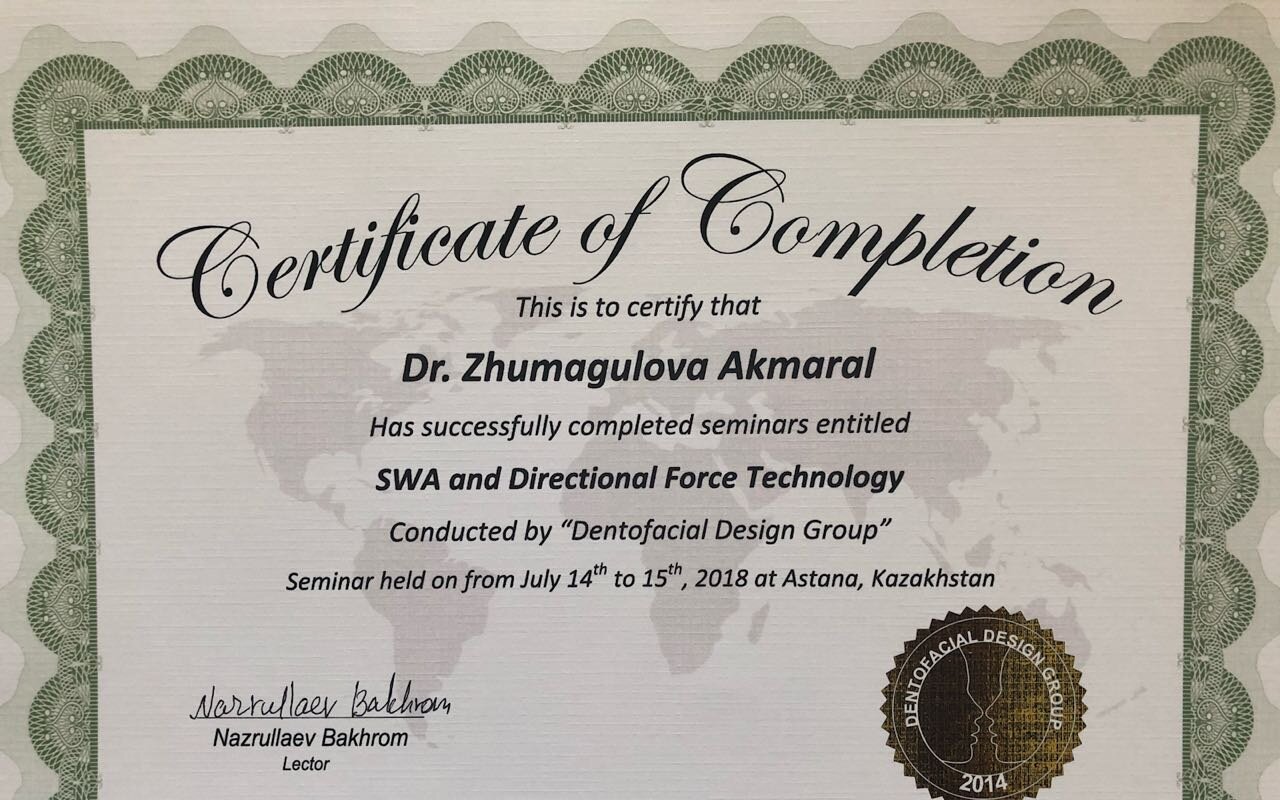 2018 — «SWA and Directional Force Technology», организатор Dentofacial Design Group, лектор Nazrullaev Bakhrom, г. Астана;