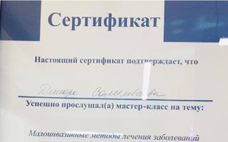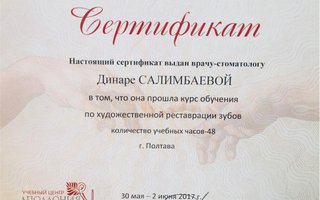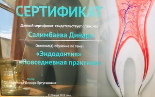 Доктор Салимбаева постоянно развивает свои профессиональные навыки и следит за новейшими тенденциями в стоматологии. Активно участвует в семинарах, конференциях и съездах, прошла повышение квалификации у ведущих мировых экспертов в области эндодонтии, таких как Михаил Соломонов, Максим Белоград, Сергей Радлинский и другие.Динара Орынгалиевна постоянно развивает свои профессиональные навыки и следит за новейшими тенденциями в стоматологии. Активно участвует в семинарах, конференциях и съездах, прошла повышение квалификации у ведущих мировых экспертов в области эндодонтии, таких как Михаил Соломонов, Максим Белоград, Сергей Радлинский и другие.... Показать еще