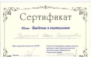 2012 — «Базовая и продвинутая имплантология», организатор учебный центр «Diamand Star», спикер MikeShulman, г. Астана;