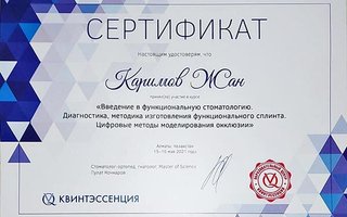 2021 — «Введение в функциональную стоматологию. Диагностика, методика изготовления функционального сплинта. Цифровые методы моделирования окклюзии», организатор образовательный центр «Квинтэссенция», лектор Пулат Кочкаров, M.S., г. Алматы;
