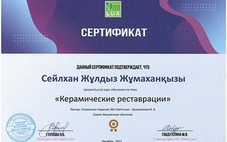 2021 — «Керамические реставрации», внутреннее обучение Dent–Lux, лектор Бульковская О. А., г. Алматы;