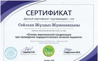 2021 — «Основы вертикальной конденсации при проведении эндодонтического лечения пациента», внутреннее обучение Dent–Lux, лектор Габдуллина М. В., г. Алматы;