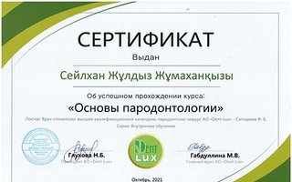 2021 — «Основы пародонтологии», внутреннее обучение Dent–Lux, лектор Саттарова Ф. Б., г. Алматы;