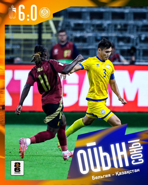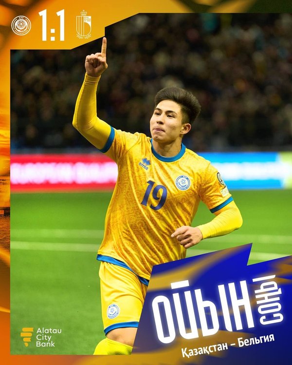 Матч аяқталды! ӘЧ-2026 іріктеу кезеңін Бельгияға қарсы матчта тең нәтижемен аяқтадық. Жарайсыңдар, жігіттер! 1:1 ️ 9’ Сәтпаев (1:0) ️ 48’ Ванакен (1:1)