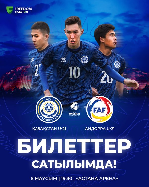 ! Бүгін Қазақстан U21 құрамасы Еуропа чемпионатының іріктеу кезеңіндегі жорығын бастайды. Алғашқы қарсыласымыз – Андорра. Сіздерді «Астана Аренада» күтеміз. Жастарымызға қолдау көрсетейік! Қазақстан U21 Андорра U21 Еуро-2027 іріктеу кезеңі 05/06 | 19:30 ️ «Астана Арена», Астана Qazsport ️ Ticketon.kz