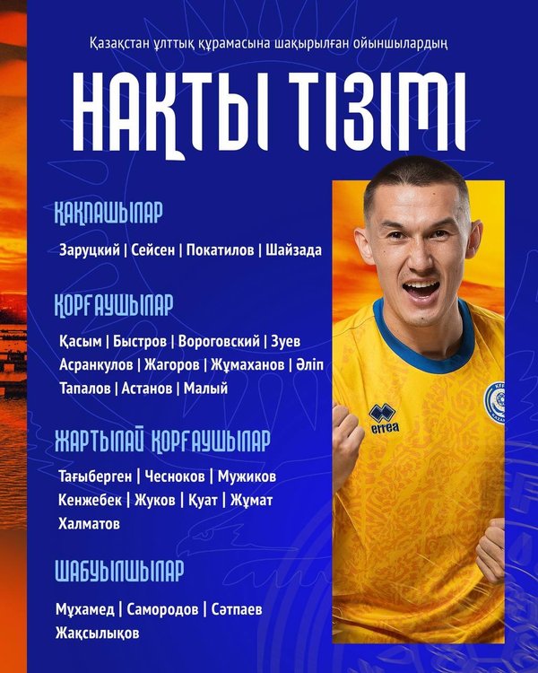 Қазақстан құрамасының Беларусь пен Солтүстік Македонияға қарсы ойындарға шақырылған нақты құрамы Құрамға 27 ойыншы енді. Оқу-жаттығу жиыны 31 мамырда Астанада басталады. Маусымда ұлттық құрама екі ойын өткізетінін естеріңізге салайық. Беларусь – Қазақстан Жолдастық матч 05.06.2025 | 22:00 (Астана уақыты) ️ «Динамо» стадионы, Минск