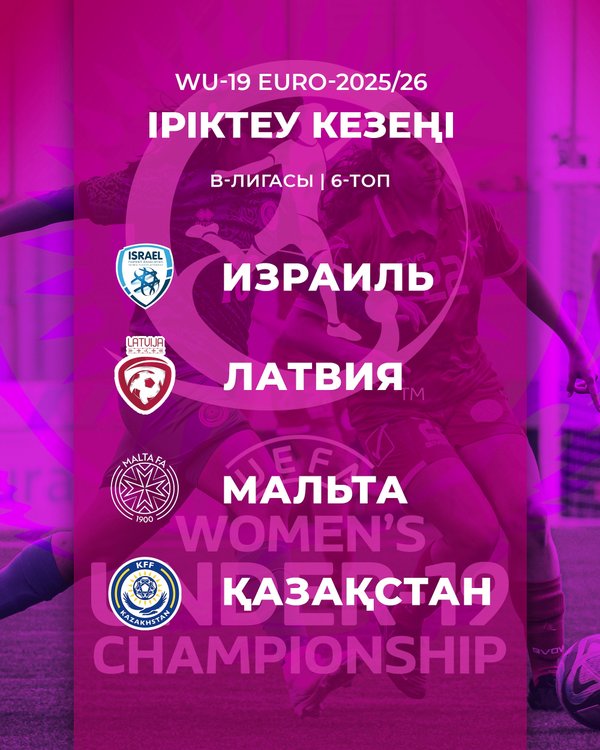 Қазақстан WU19 құрамасының ЕУРО-25/26 іріктеу кезеңіндегі қарсыластары анықталды Қазақстан WU-19 қыздар құрамасы «В» лигасының 6-тобына түсті Қарсыластарымыз: Израиль Латвия Мальта Ойындар Мальтада өтеді. Жарыстың өтетін уақыты 11 маусымда белгілі болады. Айта кетейік, өз тобында бірінші орын алған алты құрама және екінші орын алғандардың ішінен ең үздігі (төртінші орын алғандарға қарсы ойындар есепке алынбайды) келесі іріктеу кезеңін «А» лигасында бастайды.