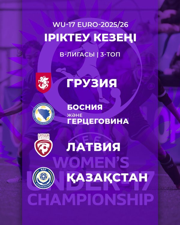 Қазақстан WU17 құрамасының ЕУРО-25/26 іріктеу кезеңіндегі қарсыластары анықталды Қазақстан WU-17 қыздар құрамасы «В» лигасының 3-тобына түсті Қарсыластарымыз: Грузия Босния және Герцеговина Латвия Ойындар Қазақстанда өтеді. Жарыстың өтетін уақыты 11 маусымда белгілі болады. Айта кетейік, өз тобында бірінші орын алған алты құрама және екінші орын алғандардың ішінен ең үздігі (төртінші орын алғандарға қарсы ойындар есепке алынбайды) келесі іріктеу кезеңін «А» лигасында бастайды.