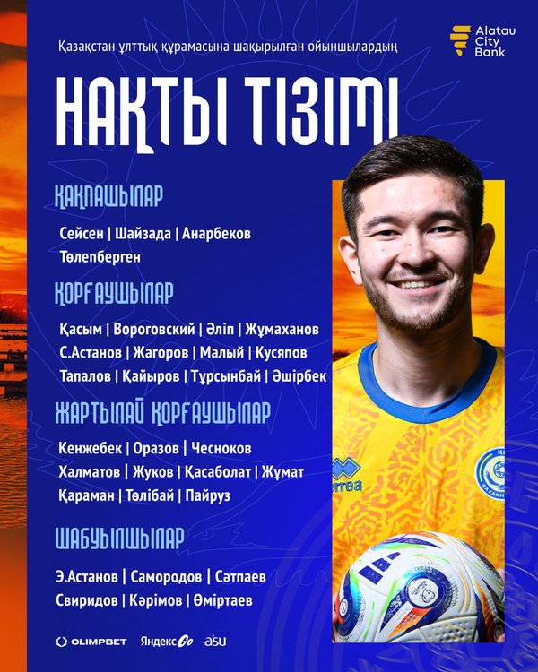 ️ Дамир Марат, Дәурен Жұмат, Алмас Төлібай – кеңейтілген тізімде Әли Әлиев маусым айында өтетін матчтарға ұлттық құрамаға шақырылған ойыншылардың кеңейтілген тізімін жариялады. Нақты тізім бірнеше күннен кейін белгілі болады. Оқу-жаттығу жиыны 31 мамырда Астанада басталады. Маусымда ұлттық құрама екі ойын өткізетінін естеріңізге салайық. Беларусь – Қазақстан Жолдастық матч 05.06.2025 | 22:00 (Астана уақыты) ️ «Динамо» стадионы, Минск
