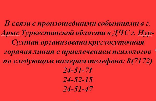о следующим номерам телефона, 24-52-15, 24-51-47. Всего по городу Нур-Султан от жителей на телефон горячей линии поступило 101 звонков. Основной характер поступивших звонков от населения: какова обстановка и масштабы ЧС; просьбы граждан об оказании помощи родственникам, оставшимся в городе Арысь (пожилые люди, несовершеннолетние дети, не транспортабельные и инвалиды), об оказании помощи родственникам, которые самостоятельно эвакуировались и не ориентируются в местности, также вопросы были о месте расположения пунктов сбора для эвакуации и поиске эвакуированных детей с детских садов. На данный момент обстановка стабильна и находится на особом контролем. Уважаемые жители и гости города, Департамент по ЧС г. Нур-Султан просит жителей сохранять спокойствие, не поддаваться панике и слухам. В случае возникновения интересующих вопросов вы можете обратиться на горячую линию по номеру:, 24-52-15, 24-51-47. ДЧС г. Нур-Султан