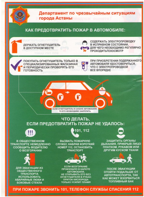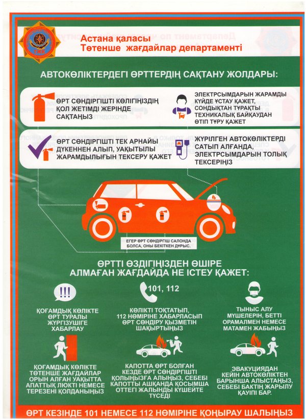 өліктерді ұзақ жылдар бойы механизмдері мен электрқұрылғыларының ақаулықтарымен қолдану, сонымен қатар рұқсат етілмеген электр құрылғыларын орнату және қолдану көп жағдайда сол құрылғылардың қызуына, қысқа тұйықталуына алып келеді. Тұрақта тұрған жеңіл автокөліктің моторлы бөлігінде өрт орын алған жағдайда жалын 8—10 минут ішінде салонға таралады, ал өз кезегінде осы салон толыққанды 1—3 минут ішінде түгел дерлік жанып кетеді. Егерде Сіздің автокөлігіңіз жанған болса, не істеу керек. Жолда келе жатсаңыз дереу тоқтап, өрт сөндіргішті алып дереу өртті сөндіруге кірісу керек. Егерде өрт сөндіргіштің көмегі өртті сөндіруге жетпесе немесе ол жұмыссыз күйде болса дереу 101 нөмірі бойынша хабарласып, өрт сөндіру бөлімдерін шақыру қажет және алдағы кезекте өртті сөндіруге құм мен қарды қолдану қажет. Өрт автокөліктің салонында орын алса мүмкіндігінше есіктер мен терезелерді ашық қалдырмау қажет. Өртті сөндіруді есікті немеесе терезені аздап қана ашып жүргізу қажет. Мүмкіндік болса аккумулятор сымдарын ажыратыңыз. Астана қаласы ТЖД ӨҚСБжПҚБ МӨББ аға инженері азаматтық қорғау аға лейтенанты Б.Е. Рахымбаев