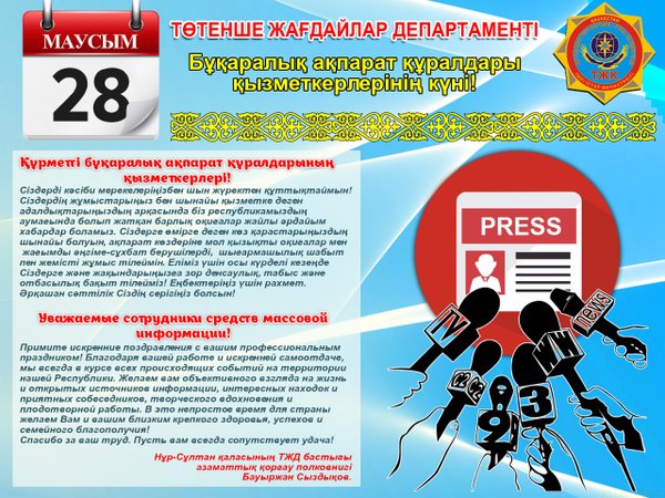 не отбасылық бақыт тілейміз! Еңбектеріңіз үшін рахмет. Әрқашан сәттілік Сіздің серігіңіз болсын! Нұр-Сұлтан қаласының ТЖД бастығы азаматтық қорғау полковнигі Бауыржан Сыздықов. . Уважаемые сотрудники средств массовой информации! Примите искренние поздравления с вашим профессиональным праздником! Благодаря вашей работе и искренней самоотдаче, мы всегда в курсе всех происходящих событий на территории нашей Республики. Желаем вам объективного взгляда на жизнь и открытых источников информации, интересных находок и приятных собеседников, творческого вдохновения и плодотворной работы. В это непростое время для страны желаем Вам и вашим близким крепкого здоровья, успехов и семейного благополучия! Спасибо за ваш труд. Пусть вам всегда сопутствует удача! С уважением, начальник ДЧС г. Нур-Султан полковник гражданской защиты Бауыржан Сыздыков.