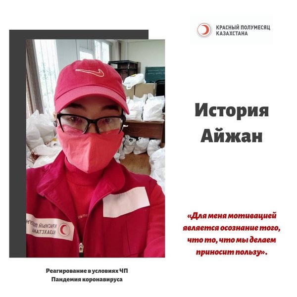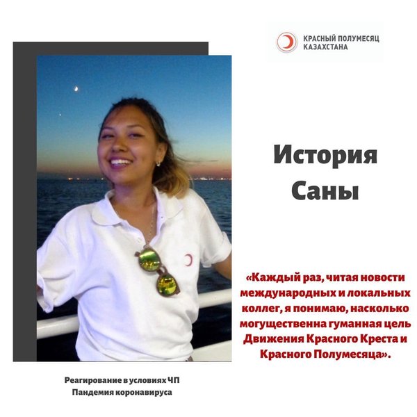 сяца, но и всех других международных Обществ Красного Креста и Полумесяца. Потому что, на данный момент я являюсь — информационным волонтером, помогая департаменту по внешним коммуникациям. Перешла с «фронт офиса» на «бэк» ⠀ Каждую неделю стараюсь посвящать своё время обработке международных и локальных новостей. Если они на английском, перевожу и оформляю для более лёгкого визуального восприятия читателей наших социальных сетей, как — инстаграм и новостной портал. ⠀ В период карантина, когда есть ещё и основная работа, конечно сложно ездить в офис Красного Полумесяца, и помогать людям вместе с фронтовой командой. Поэтому, я предпочитаю быть полезной сидя на карантине, обрабатывая необходимую информацию для казахстанских читателей. Совмещать такую деятельность со своей основной работой — очень удобно. В ходе выполнения нескольких таких вещей, я научилась многому от сотрудников департамента, в особенности от Нурилы. ⠀ Каждый раз, читая новости международных и локальных коллег, я понимаю, насколько могущественна гуманная цель Движения Красного Креста и Красного Полумесяца. Насколько чутко каждый сотрудник и волонтёр трудится во благо нуждающихся семей. В свою очередь, считаю, что у каждого есть возможность делать добрые дела, даже сидя на дома на карантине». ⠀ Если Вы волонтер Красного Полумесяца Казахстана, и готовы поделиться своей историей реагирования во время Covid-19, просим присылать свои истории на почту pr@redcrecent.kz