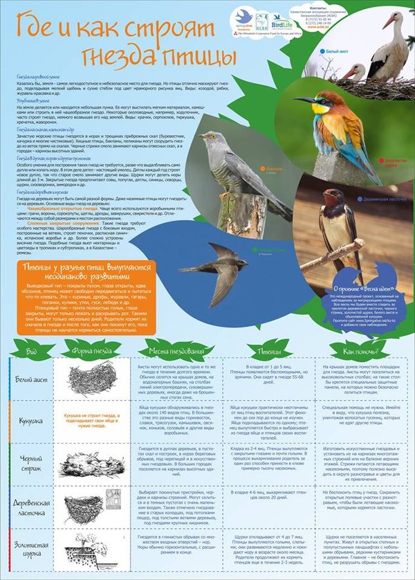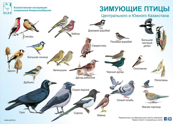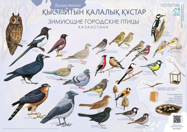 Плакат «Зимующие городские птицы Казахстана» для детей. Распечатанные плакаты можно получить в офисах АСБК в Алматы и Астане по предварительной записи по тел.