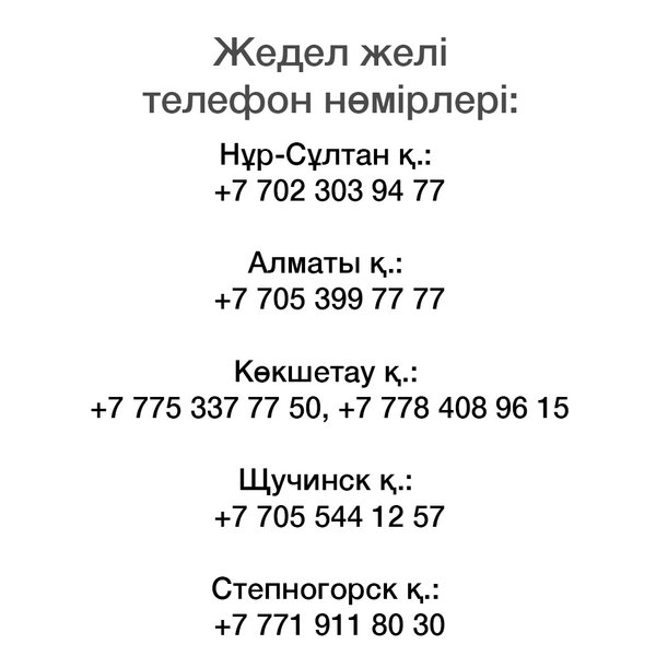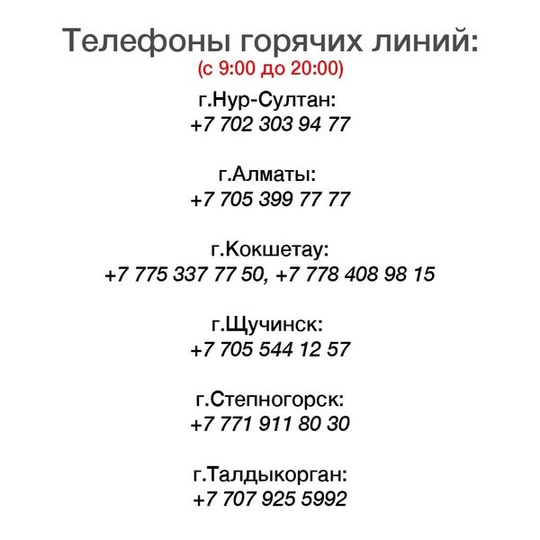рячей линии и стать одним из нас! ⠀ Во время карантина очень важно всем, включая тех, кто не находится в зоне риска, соблюдать все меры безопасности, о которых говорят @healthcare.gov.kz @who. Одна из самых эффективных мер – находиться дома и не выходить на улицу. ⠀ Есть люди, которые не успели запастись самым необходимым, продуктами и медикаментами. Если вы знаете людей, которые действительно нуждаются в помощи (одинокие пожилые, с особыми потребностями, в трудной жизненной ситуации) вы можете сообщить на одну из объединенных республиканским фронт-офисом волонтеров горячих линий ниже. ⠀ Если в вашем доме, в подъезде, поблизости живут такие люди вы можете оказать им помощь сами, элементарно сходив за них в магазин или аптеку! Сейчас как никогда важно и нужно держаться вместе и доказать, что #BizBirgemiz! ⠀ Телефоны горячих линий: г.Нур-Султан: г.Алматы: ⠀ Дополнительно: г.Кокшетау:, г.Щучинск: г.Степногорск: г.Талдыкорган: ⠀ kz_nvs @qazvolunteer.kz