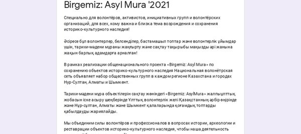 олонтёров и профессионалов в вопросах истории, археологии и реставрации объектов историко-культурного наследия, чтобы наша деятельность стала ещё более продуктивной! Вместе с вами мы: — определим алгоритмы и механизмы дальнейшего взаимодействия для работы на долгосрочной перспективе; — разработаем эффективную информационную кампанию по привлечению интереса к сохранению историко-культурного наследия. Заполните анкету по ссылке и станьте частью общеказахстанского движения по возрождения и сохранения историко-культурного наследия. Вместе мы сможем! Набор открыт до 15 августа. Во всем вопросам обращаться на горячую линию оператора Республиканского Фронт-офиса поддержки волонтёрства Whats’app и звонки) Ата-бабалардың мәдениеті мен мұрасын құрметтеу, тарихқа бойлау, археология романтикасы… Бұл сіз туралы ма? Әсіресе бұл волонтерлер, белсенділер, бастамашыл топтар және волонтерлік ұйымдар үшін, тарихи-мәдени мұраны жаңғырту және сақтау тақырыбы маңызды әрі жанына жақын барлық адамдарға арналған! Тарихи-мәдени мұра объектілерін сақтау жөніндегі «Birgemiz: AsylMura» жалпыұлттық жобасын іске асыру шеңберінде Ұлттық волонтерлік желі Қазақстанның әрбір өңірінде және Нұр-сұлтан, Алматы және Шымкент қалаларында қоғамдық топтарды қабылдауды жариялайды. Біздің қызметіміз бұдан да нәтижелі болуы үшін біз тарих, археология және тарихи-мәдени мұра объектілерін қалпына келтіру мәселелерінде волонтерлер мен кәсіпқойлар күшін біріктіреміз! Біз сіздермен бірге: — ұзақ мерзімді перспективада жұмыс істеу үшін одан әрі өзара іс-қимыл алгоритмдері мен тетіктерін анықтаймыз; — тарихи-мәдени мұраны сақтауға қызығушылықты арттыру бойынша тиімді ақпараттық науқан әзірлейміз. Сілтеме бойынша өтіп @, сауалнаманы толтырыңыз және тарихи-мәдени мұраны жаңғырту және сақтау жөніндегі жалпы қазақстандық қозғалыстың бір бөлігі болыңыз. Біз бірге жасай аламыз! Қабылдау 15 тамызға дейін ашық. Барлық сұрақтар бойынша волонтерлікті қолдаудың Республикалық Фронт-офисі операторының жедел желісіне жүгінуге болады Whats'app және қоңыраулар)