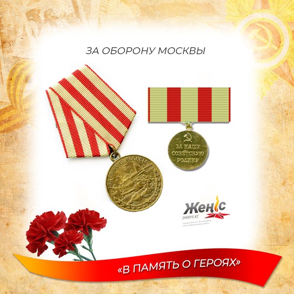 года, однако окончательный вариант медали созданной по эскизам художника Москалева был утвержден только в мае 1944 года. На медали изображен танк Т-34 с солдатами на броне, на фоне памятника Минину и Пожарскому и Кремлевской стены, за стеной виден купол здания правительства с поднятым флагом на котором изображены серп и молот, в небе видны летящие самолеты. По верхнему ободу надпись «ЗА ОБОРОНУ МОСКВЫ» по нижнему лавровые ветви разделенные по центру пятиконечной звездой. На реверсе серп и молот и надпись «ЗА НАШУ СОВЕТСКУЮ РОДИНУ». В результате боев по обороне столицы СССР было убито 927 тыс. человек, 880 тыс. человек было ранено или обморожено, медаль За оборону Москвы была создана для того чтобы отметить всех участников героической обороны. Medal 1941 jyldyń qazan aıynan 1942 jyldyń qańtar aıyna deıіn Máskeýdіń qorǵanys іs-qımyldarynda jumys іstegen barlyq qatysýshylardy marapattaý úshіn taǵaıyndalǵan. Qyzyl Armııa jaýyngerlerі Vermahtty sońǵy kúshterdі urysqa engіzýge májbúr bolǵan qan tógіlgen urystardan keıіn Keńes áskerlerі qorǵanystan shabýylǵa kóshýge qol jetkіzdі. Adolf Gıtler 1941 jyldyń jeltoqsany basynda keńes-german maıdanyndaǵy barlyq áskerlerdіń qorǵanysqa ótýі týraly dırektıvany shyǵarady. Medaldy jasaý boıynsha jumystar 1943 jyldyń maýsym aıynda bastaldy, bіraq sýretshі Moskalevtіń eskızderі boıynsha jasalǵan medaldіń sońǵy nusqasy tek 1944 jyldyń mamyr aıynda ǵana bekіtіldі. Medalda T-34 tankіsі beınelengen, Mının men órt jáne Kreml qabyrǵasynyń eskertkіshіnіń aıasynda, qabyrǵasynyń artynan jalaýy kóterіlgen úkіmet ǵımaratynyń kúmbezі kórіnedі, onda serp pen balǵa beınelengen, aspanda ushatyn ushaqtar kórіnedі. Joǵarǵy jıek boıymen tómengі lavr butaqtary ortasynda bes buryshty juldyzmen bólіngen «Máskeýdі qorǵaǵany úshіn» degen jazý bar. Serp pen balǵa reversіnde jáne «bіzdіń Sovet Otany úshіn„degen jazý bar. KSRO astanasynyń qorǵanysy boıynsha shaıqastardyń nátıjesіnde 927 myń adam óltіrіldі, 880 myń adam jaralandy nemese úsіk shalǵan, Máskeýdі qorǵaǵany úshіn medal batyrlyq qorǵanystyń barlyq qatysýshylaryn belgіleý úshіn jasaldy. --- The medal was established to award all participants engaged in the defensive actions of Moscow from October 1941 to January 1942. The Moscow operation became a turning point during the great Patriotic war, after bloody battles in which red army soldiers forced the Wehrmacht to put the last forces into battle, the Soviet troops managed to move from defense to offensive. In early December 1941, Adolf Hitler issued a Directive on the transition of all troops on the Soviet-German front to the defense. Work on the creation of the medal began in June 1943, but the final version of the medal created according to the sketches of the artist Moskalev was approved only in may 1944. The medal shows a T-34 tank with soldiers on armor, against the background of the monument to Minin and Pozharsky and the Kremlin wall, behind the wall you can see the dome of the government building with a raised flag that shows a hammer and sickle, in the sky you can see flying planes. On the upper rim the inscription «FOR the DEFENSE of MOSCOW“ on the lower Laurel branches divided in the center by a five-pointed star. On the reverse is a hammer and sickle and the inscription „FOR OUR SOVIET HOMELAND“». As a result of fighting to defend the capital of the USSR, 927 thousand people were killed, 880 thousand people were injured or frostbitten, and the medal for the defense of Moscow was created to mark all participants in the heroic defense.