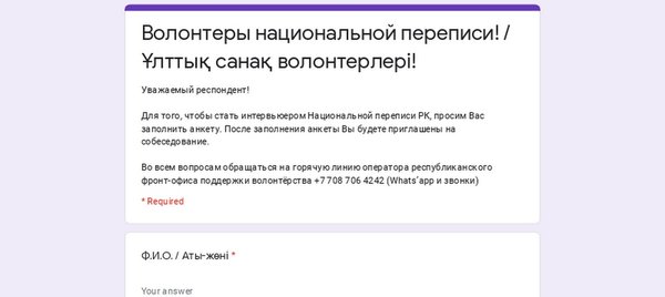 сь период) разъяснять цели и задачи проводимой переписи, опрашивать и вносить полученные сведения в выданный на время работы специальный планшет (в комплекте со всем необходимым). Какие требования к Волонтёру национальной переписи (интервьюеру)? Гражданин РК, старше 18 лет, инициативный, ответственный, коммуникабельный, имеющий навыки работы с планшетом. Желательно владение казахским и русским языками. Волонтёр должен быть вакцинированным. Какую компенсацию получает Волонтёр и какие есть поощрения? • Денежная компенсация составляет 104 179 тенге с удержанием обязательных пенсионных взносов, индивидуального подоходного налога, а также взносов обязательного социального медицинского страхования (ОСМС). • В регионах предусмотрен бесплатный проезд. • Волонтёрам будут предоставлены портфель и шарф с логотипом национальной переписи населения Республики Казахстан 2021 года. • По итогам переписи населения отличившиеся интервьюеры будут отмечены почетными грамотами и благодарственными письмами и другими видами поощрения от лица Бюро национальной статистики, Агентства по стратегическому планированию и реформам. Для того, чтобы заполнить анкету, проходите по ссылке: