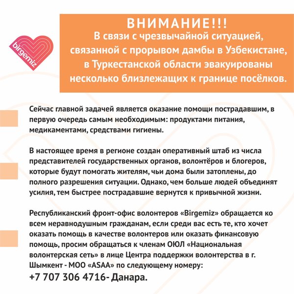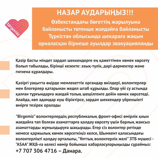 и, которые не успели запастись самым необходимым, продуктами и медикаментами. Если вы знаете людей, которые действительно нуждаются в помощи (одинокие пожилые, с особыми потребностями, в трудной жизненной ситуации) вы можете сообщить на одну из объединенных республиканским фронт-офисом волонтеров горячих линий ниже. Если вы хотите помочь этим людям в качестве волонтера: фасовать, разносить продукты питания, то вы можете присоединиться и стать одним из нас! Если в вашем доме, в подъезде, поблизости живут такие люди вы можете оказать им помощь сами, элементарно сходив за них в магазин или аптеку! Сейчас как никогда важно и нужно держаться вместе и доказать, что #BizBirgemiz! Телефоны горячих линий: г.Нур-Султан: г.Алматы: Дополнительно: г.Кокшетау:, г.Щучинск: г.Степногорск: kz_nvs @qazvolunteer.kz — Құрметті Нұр-сұлтан және Алматы қаласының тұрғындары! Қазақстанда COVID-19 жұқтырудың жаңа жағдайлары анықталуда және екі ірі қала карантинге жабылды. Тәуекел аймағында – зейнеткерлер, өмірлік қиын жағдайға тап болған адамдар, иммунитеті нашар адамдар және созылмалы аурулары бар адамдар бар. Карантин кезінде қауіп-қатер аймағында орналаспаған адамдарды қоса алғанда, @healthcare.gov.kz @who айтып жатқан барлық қауіпсіздік шараларын сақтау өте маңызды. Ең тиімді шаралардың бірі — үйде болып, далаға шықпау. Ең қажетті, азық-түлік пен дәрі-дәрмектермді сатып алып үлгермеген адамдар бар. Егер сіз шынымен көмекке мұқтаж адамдарды білсеңіз (жалғыз қарт адамдар, ерекше қажеттіліктері бар, өмірлік қиын жағдайда) сіз төмен ыстық желілердің біріне хабарлай аласыз. Егер сіз бұл адамдарға волонтер ретінде буып-түю, азық-түлікті тарату арқылы көмектескіңіз келсе, онда сізді бізге қосылуға шақырамыз! Егер сіздің үйіңізде, подъезде, жақын маңда мұндай адамдар тұратын болса, сіз оларға өзіңіз қарапайым дүкенге немесе дәріханаға барып келу арқылы көмек көрсете аласыз! Қазіргі уақытта бірге болып, #BizBirgemiz екендігімізді дәлелдеу өте маңызды. Жедел желі телефон нөмірлері: Нұр-Сұлтан қ.: Алматы қ.: Қосымша: Көкшетау қ.:, Щучинск қ.: Степногорск: kz_nvs @qazvolunteer.kz — Dear residents of the city of Nur Sultan and Almaty! New cases of COVID-19 infection continue to be detected in Kazakhstan, and the two largest cities are quarantined. Pensioners, people in difficult situations, people with weak immunity and people with chronic diseases are at risk. During quarantine, it is very important for everyone, including those who are not at risk, to follow all the security measures that @healthcare.gov.kz and @who are talking about. One of the most effective measures is to stay at home and not go out. There are people who didn’t have time to stock up on the most necessary, food and medicine. If you know people who really need help (single elderly, with special needs, in difficult life situations), you can report to one of the hotlines below. If you want to help these people as a volunteer: to pack, distribute food, then you can join and become one of us! If such people live in your house, in the entrance, nearby, you can help them yourself by simply going to a store or pharmacy for them! Now more than ever it is important and you need to stick together and prove that #BizBirgemiz! (We’re together) Hotline Phones: Nur-Sultan: Almaty city: Additionally: Kokshetau:, Shchuchinsk: Stepnogorsk: National Volunteer Network of Kazakhstan @kz_nvs @qazvolunteer.kz