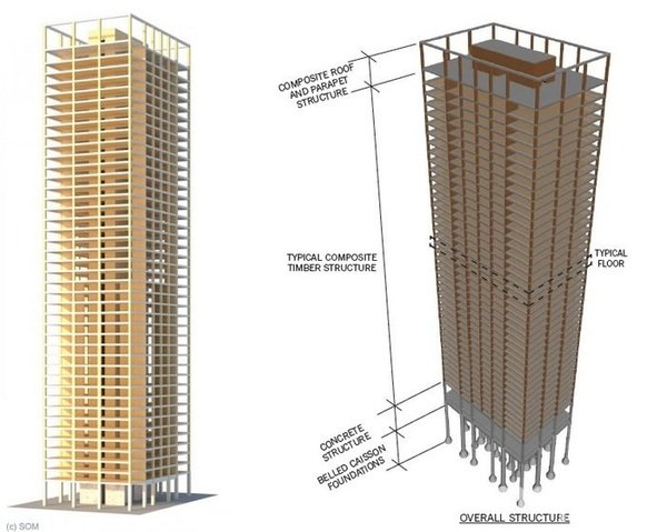 ительной отрасли. Этот показатель можно значительно снизить, если при строительстве новых зданий использовать деревянные конструкции. Если верить последним исследованиям в строительной отрасли, то новые технологи позволяют строить деревянные здания высотой 25—30 этажей. Так же, можно совмещать дерево и традиционные строительные материалы, что позволит увеличить высоту подобных зданий. «Большое дерево» представляет собой университетский комплекс. Деревянный небоскреб будет состоять из офисных и жилых помещений. Зелёные крыши находящиеся на нижних этажах конструкции созданные не только для прогулок но и для экономии электричества на охлаждения объекта. Чикаго заслуженно обладает званием «родина небоскребов». В 20 веке был всплеск новый технологий строительства высотных зданий, что привело к бурному возведению небоскребов. Автор проекта надеется, что новый проект сильно поспособствует возрождению строительства высотных зданий на более качественном уровне.