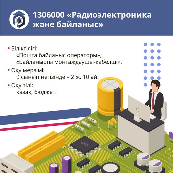негізде, 9 сыныптан кейін, мемлекеттік тілде, оқу мерзімі 2 жыл 10 ай. «Электр байланысы жəне желімен хабарлаудың желілік құрылыстарын пайдалану» Біліктілігі: «Электр байланысы жəне желімен хабарлау желілік құрылыстарының электр монтері» — бюджеттік негізде, 9 сыныптан кейін, орыс тілінде, оқу мерзімі 2 жыл 10 ай.