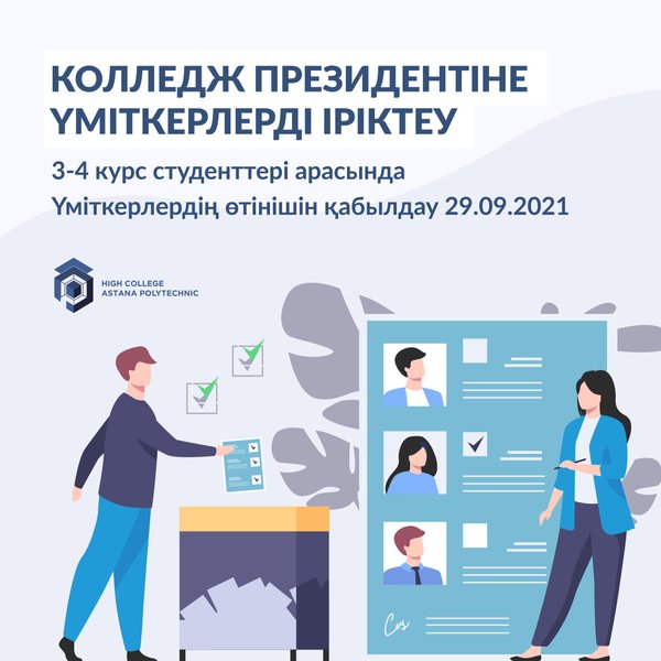 Үміткерлердің өтінішін қабылдау 29.09.2021ж. дейін жүргізіледі. Барлық сұрақтармен төмендегі телефонға хабарлассаңыздар болады: Арман Дана Үміткерлер тапсыратын құжаттар тізімі: 1. Топ кураторынан мінездеме; 2. Өмірбаян; 3. Сайлау алдындағы бағдарлама; 4. 3х4 фотосурет. Стартовал отбор кандидатов на пост Президента колледжа среди студентов 3—4 курсов.