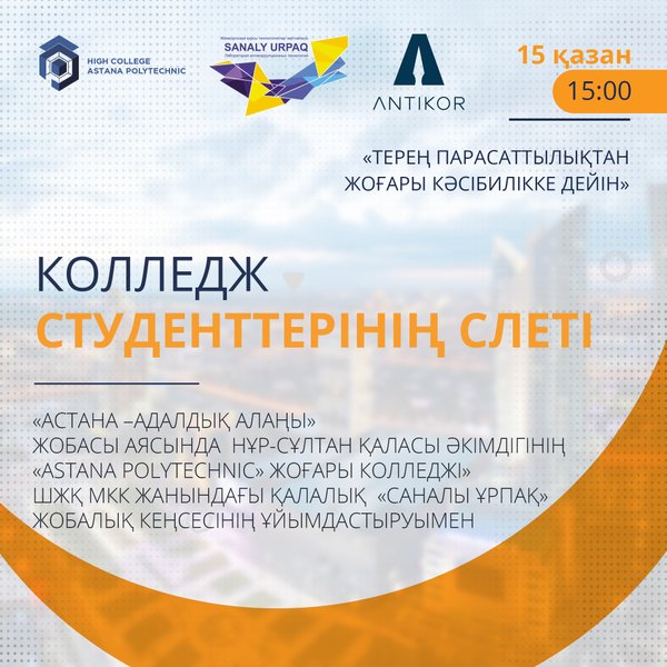 ктный офис «Саналы ұрпақ» «Высшего колледжа „ASTANA POLYTECHNIC“ проводит слет студентов колледжей города Нур-Султан. Тема слета: „ОТ ГЛУБОКОЙ ДОБРОПОРЯДОЧНОСТИ ДО ВЫСОКОГО ПРОФЕССИОНАЛИЗМА“». Целю слета является формирование у молодежи негативного отношения к проявлениям коррупции и формированию активной гражданской позиции молодежи в преодолении коррупции.