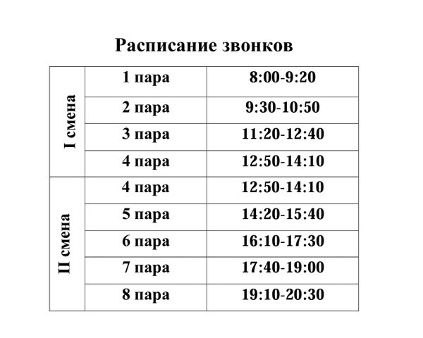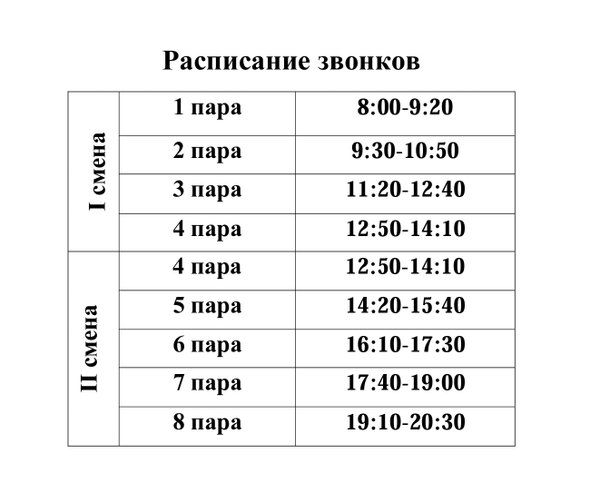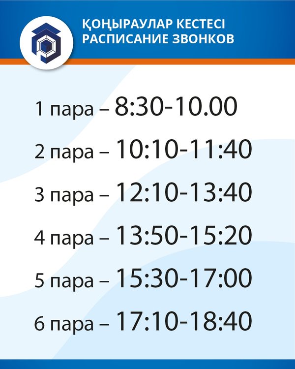 Үлкен үзіліс 2 парадан кейін 30 минутқа жалғасады. Большая перемена — 30 минут, после 2 пары.