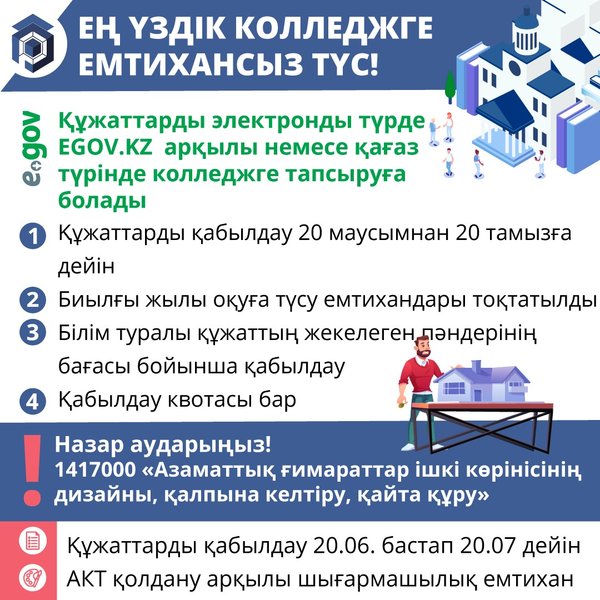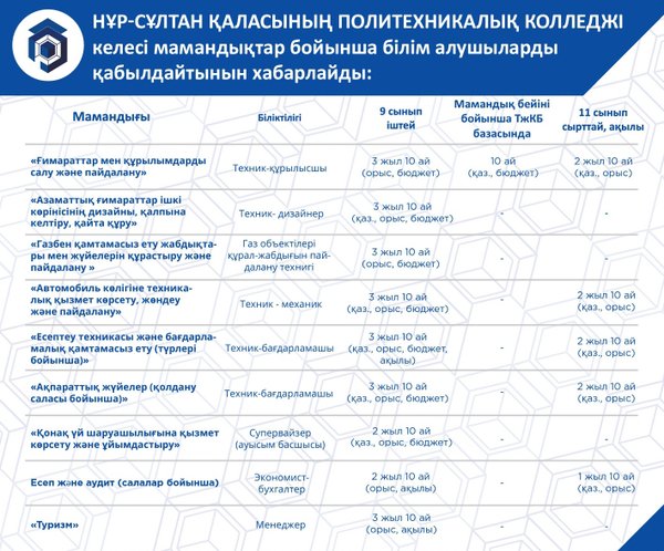 Политехникалық колледж талапкерлерді қабылдайтының хабарлайды! Қабылдау 20 маусымнан басталады.