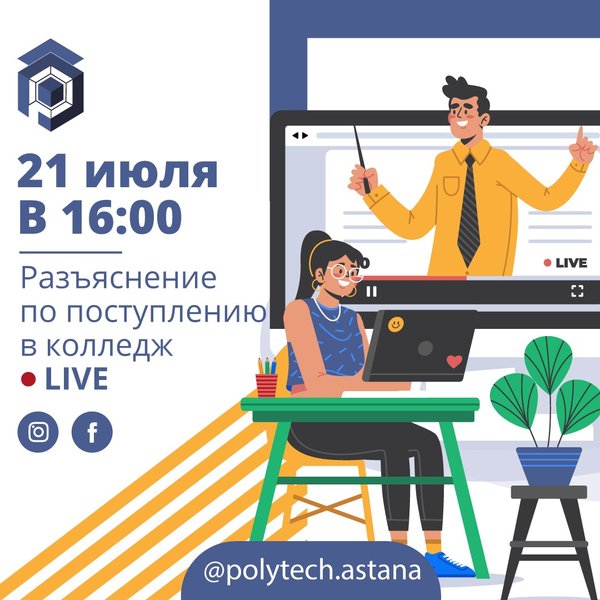Тікелей эфирде — Политехникалық колледжі қабылдау комиссиясының жауапты хатшысы Айсулу Абдрахманова. Əлеуметтік желілерде 21 шілде күні, сағат 16.00-де. В прямом эфире ответственный секретарь приемной комиссии Политехнического колледжа Айсулу Абдрахманова.