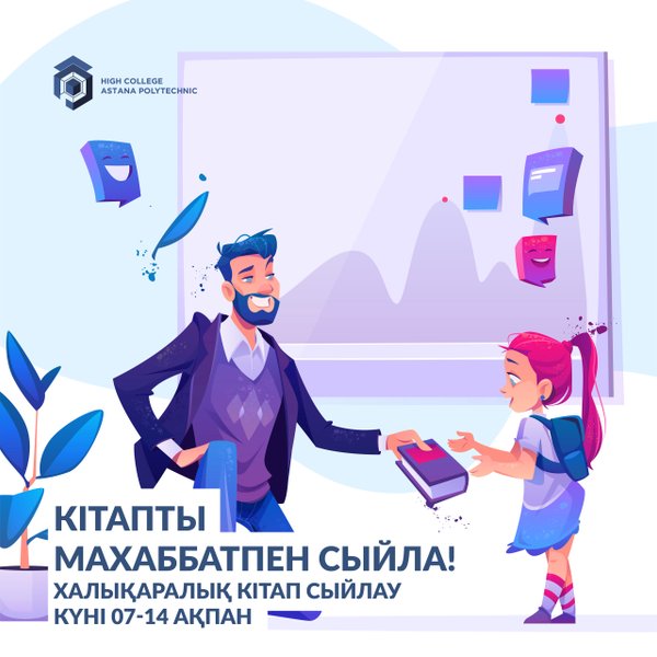 Колледж студенттерін Халықаралық кітап сыйлау күніне арналған «Кітапты махаббатпен сыйла!» акциясына қатысуға шақырамыз. Сыйлықты кітапханаға беруге болады. Бірінші оқу корпусы, 2-ші қабат, кітапхана. Приглашаем студентов колледжа принять участие в международной акции «Дарите книги с любовью» приуроченной к Международному дню книгодарения. Свой презент можете передать в библиотеку. Главный корпус, 2 этаж, библиотека.