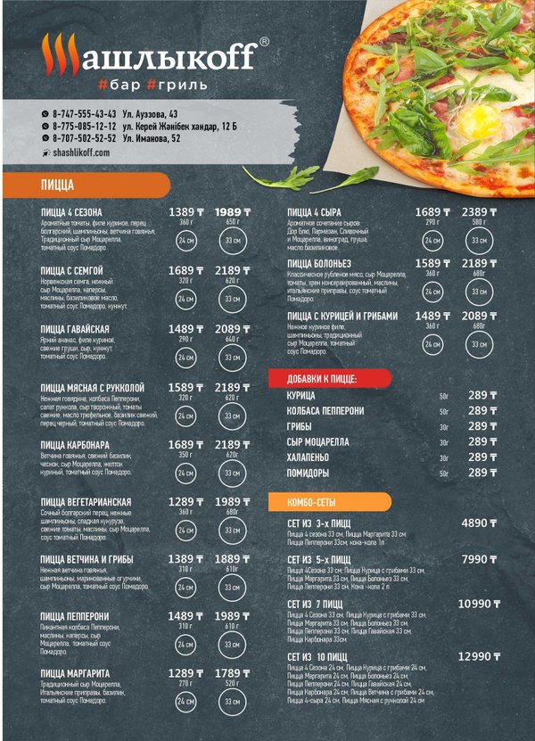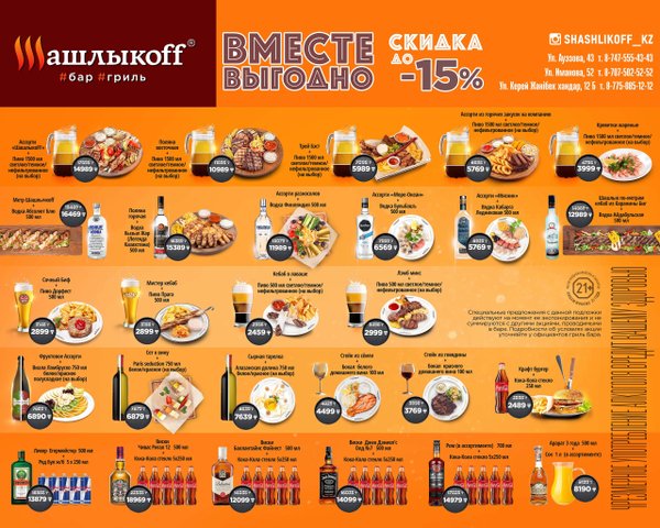 се включено за 15.000 тг, при предварительном бронировании. ⠀ ⠀ ️*Подробности можно узнать по телефону, либо в любом гриль-баре столицы:⠀ ⠀ Иманова, 52⠀⠀⠀ 57-41-63, Ауэзова, 43⠀⠀ 31-57-47, Керей Жанибек хандар, 12Б 47-28-21, ⠀⠀⠀⠀⠀⠀⠀ Instagram: ⠀⠀⠀⠀⠀⠀⠀ @shashlikoff_kz⠀